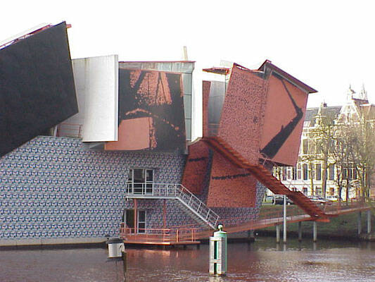 Groninger Museum. Het Groninger Museum is binnen Nederland ongetwijfeld het meest van de buitenkant gefotografeerde museum. Vanaf elke kant tref je weer nieuwe verrassende vlakken, ornamenten en vormen. Begin 1999 heb ik een serie foto's gemaakt, die uitnodigen ook zelf eens te gaan kijken. Mijn werk lag in die tijd pal achter het museum. Datum: 24 januari 1999. Camera: Sony Mavica FD91.