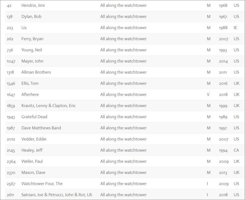 Meest voorkomende nummer in mijn l;ijst is: 'all along the watchtower' [18x]. Dit prachtige nummer van Bob Dylan is favoriet bij veel grote artiesten. [ YouTube | origineel van Bob Dylan, live op Woodstock ]